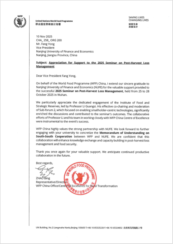 近日,我校收到来自联合国世界粮食计划署(WFP)中国办公室的感谢信,高度评价并诚挚感谢我校对2025粮食...