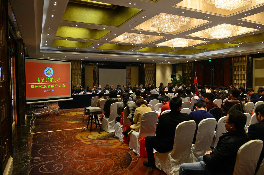 南京财经大学常州校友会成立大会会场校党委书记陈章龙向常州校友会授旗 副校长乔均讲...