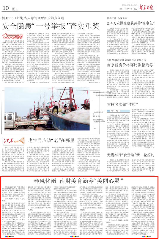 9月15日,《新华日报》以“春风化雨 南财美育涵养‘美丽心灵’”为题报道了我校美育工作成效。文章从“...