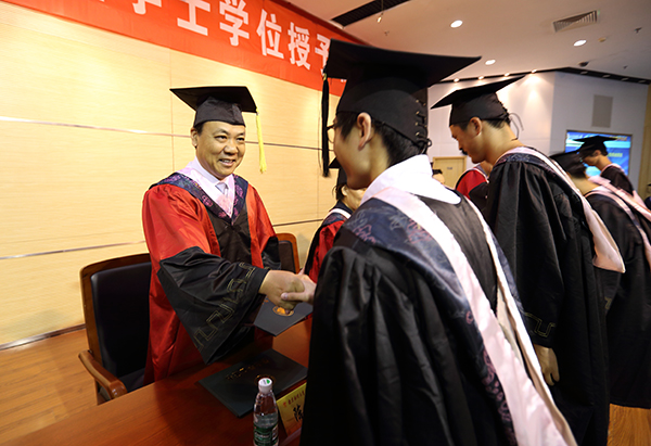 校党委书记陈章龙为毕业生授予学士学位证书 校长刘志彪为毕业生拨过学位帽上的流苏 ...