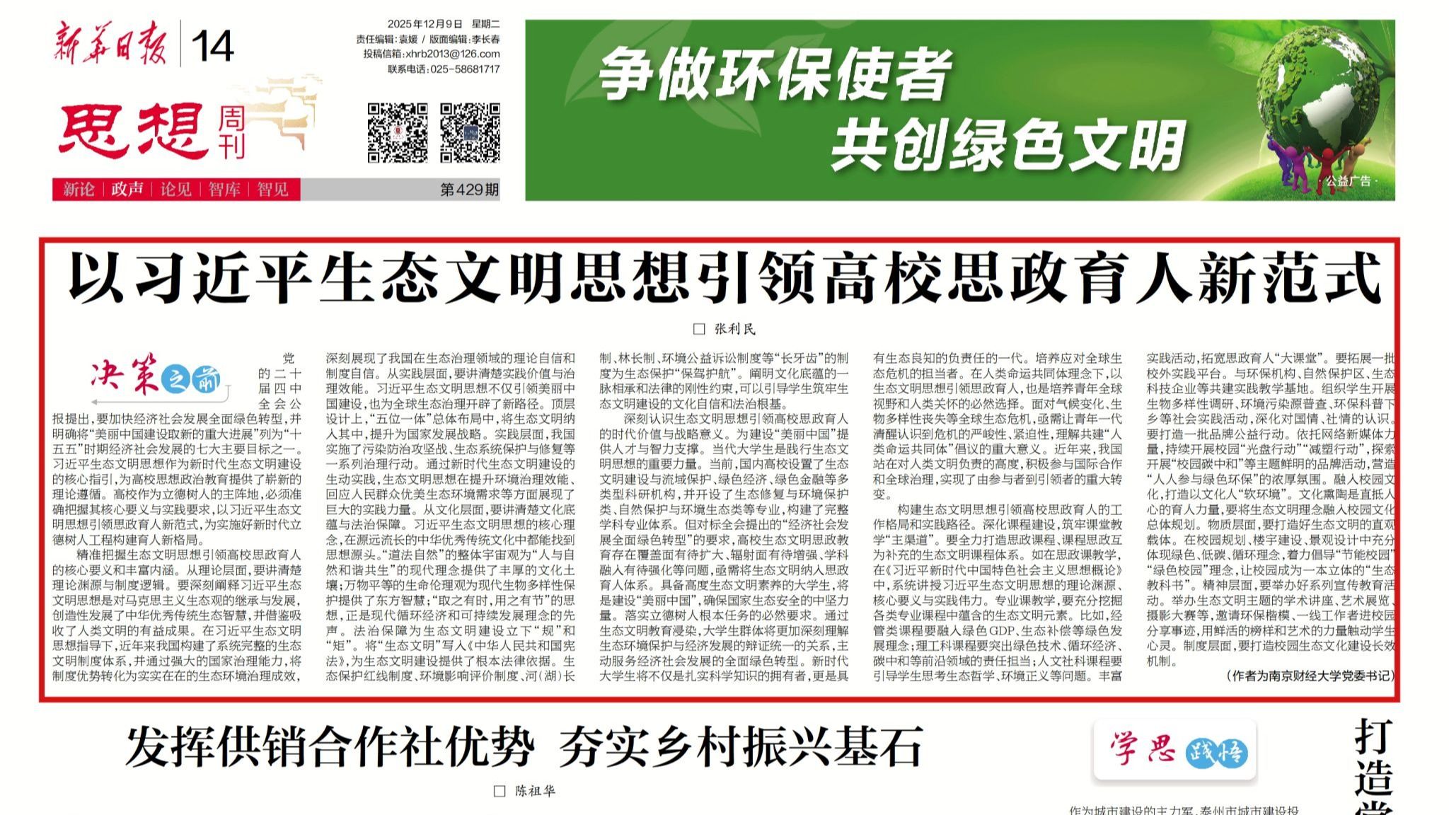 12月9日,《新华日报》刊发了校党委书记张利民的署名文章《以习近平生态文明思想引领高校思政育人新范式...