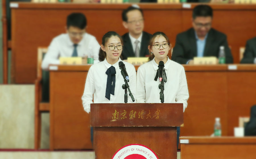 毕业研究生代表、经济学院倪蓉同学,毕业本科生代表、会计学院“双胞胎”张婕、张妤同学先后发言,她们代表全体毕业生感谢母校的精心培育,感谢父母的养育之恩,感谢老师的言传身教,表示将带着母校的教诲和时代的期盼出发,不忘初心,砥砺前行,带梦起航!