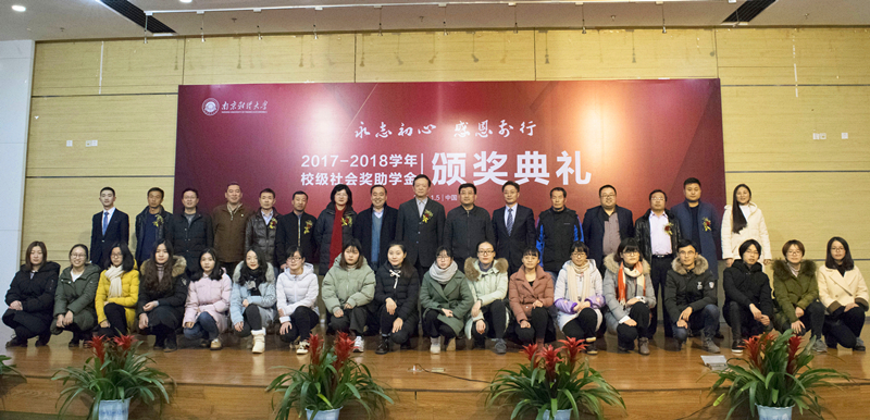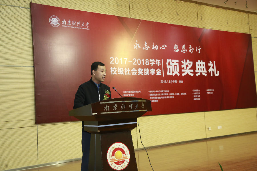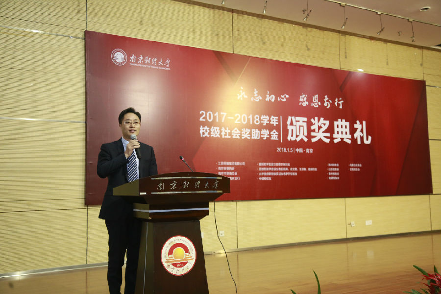 1月5日下午,南京财经大学“永志初心 感恩前行”2017—2018学年校级社会奖助学金颁奖典礼在仙林校区图书馆报告厅举行。校长宋学锋,副校长程永波、乔均、邱伟芬出席活动,捐赠设奖单位代表、校友代表、相关单位负责人,师生代表近300人参加典礼。颁奖典礼由外国语学院2016级蒋汤浩同学主持。