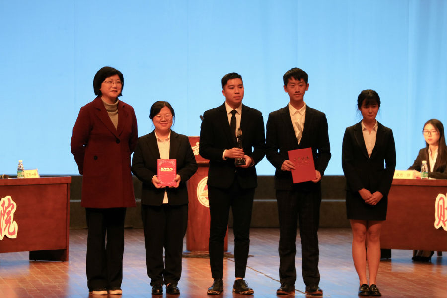 经过评委的投票,国际经贸学院获得冠军,财政与税务学院获得亚军;财政与税务学院的任畅同学获得“最佳风度奖”,国际经贸学院的张博琳同学获得“最佳辩手奖”。相关领导为获奖选手及队伍颁奖。