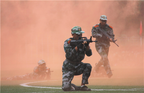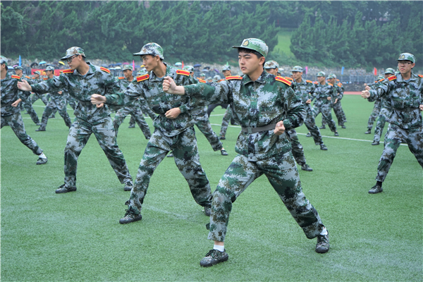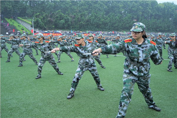 护旗手护卫“八一”军旗和南京财经大学红山学院院旗进入会场,2017级新生军训成果汇报正式开始。由2017级新生组成的18个分列式方阵,踏着整齐的步伐、喊着铿锵的口号、昂首阔步依次走过主席台,展现了红山学子青春向上、朝气蓬勃的精神风貌。随后,参训新生进行了匕首操、军体拳、战术基本动作等精彩表演,赢得了现场热烈的掌声。