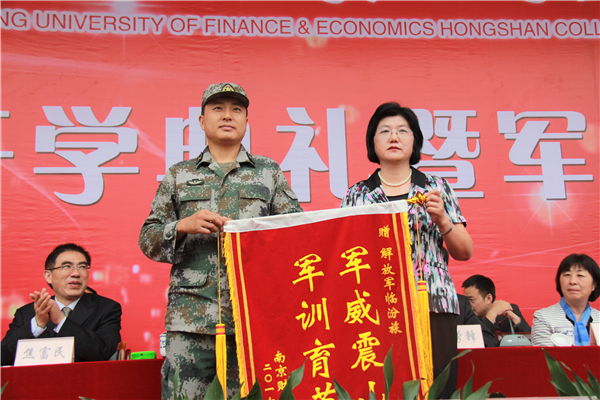 南京财经大学副校长邱伟芬向中国人民解放军临汾旅赠送锦旗。
