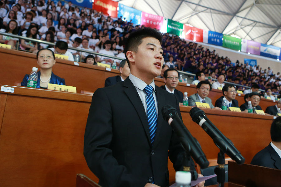 在校生代表、法学1403班王天宇发言。他说,在人生最宝贵的时光里,师兄师姐们埋头苦读、拼搏奋进,把汗水和泪水汇集成勤奋的海洋,和母校一同见证了成长和进步。祝福师兄师姐们在人生新的征程里,做自己的王者,书人生的荣耀。