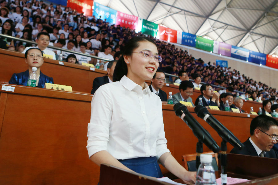 毕业生代表、劳社保1301班范博文发言。她代表全体毕业生感谢母校的谆谆教诲,感谢父母的养育之恩,感谢老师的言传身教,表示将把记忆装进精美的毕业纪念册,把梦想打包放进自己的行囊,不断去攀登人生新的高峰。