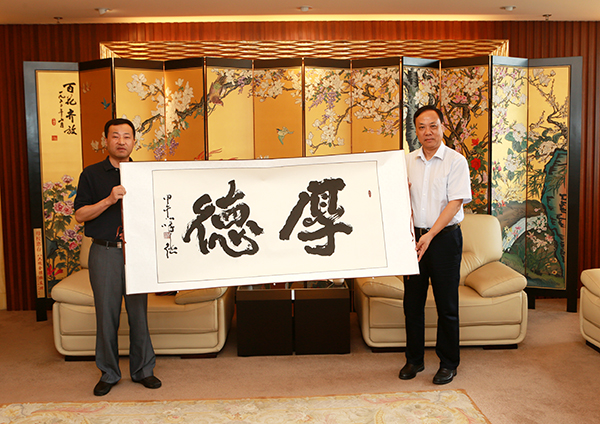 陈章龙书记向蔡卫东校友赠送书法作品《厚德》