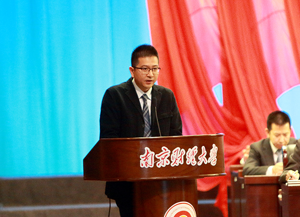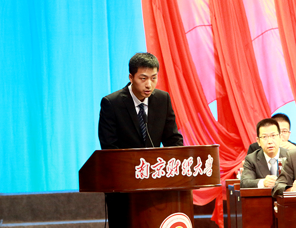 在校生代表、2015级金融学专业研究生秦川同学发言。他说,作为一名研究生,要在夯实专业基础的同时,不断拓宽知识面;要展现品正学实、奋起上进的精神风貌。