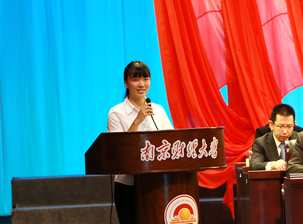 新生代表、2016级马克思主义学院思想政治教育专业屈文锦同学发言。她代表新生向领导和老师们表示崇高的敬意,并表态作为新时代的南财人,会以扎实的学风、丰硕的成果续写学业新篇章。