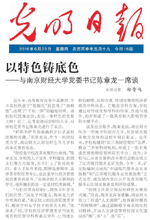 6月7日,校党委书记陈章龙接受《光明日报》记者郑晋鸣专访,介绍了我校按照“大财经”理念,找准定位特色发展,培育学校发展新优势,造就学校核心竞争力的思路与实践。6月23日,《光明日报》以《以特色铸底色——与南京财经大学党委书记陈章龙一席谈》为题,刊发了专访报道。(点击阅读全文)