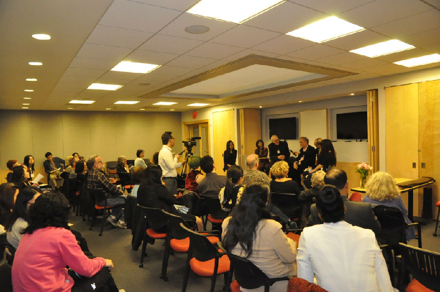 研讨会由Roof Books主编、著名作家和诗人James Sherry先生主持,我校纽约商务孔子学院美方院长Maryalice Mazzara博士致欢迎辞。美国著名语言派诗人Bob Perelman,美国先锋诗人Nada Gordon,美国华裔诗人Tan Lin, Cecilia Wu以及中国诗人、我校纽约商务孔子学院中方院长孙冬博士分别朗诵了自己的作品。随后,嘉宾们就不同族群和文化对诗歌创作及交互性翻译的影响进行了深入的交流。Bob Perelman和Nada Gordon就庞德对交互性诗歌翻译的影响及翻译过程中如何忠于原文发表了看法,Tan Lin和Ceclia Wu则从自身成长经历出发,谈了家族历史和少数族裔身份对创作的影响。孙冬博士主要谈了在跨文化背景下美国文化是如何影响中文诗歌创作的。现场观众参与度很高,就中美诗歌的鉴赏和翻译等话题与嘉宾们进行了深入的探讨。活动还邀请了古琴艺术家吕皎月进行伴奏表演。中央电视台、China Daily、纽约侨报等多家媒体记者都到场对活动进行了采访报道。