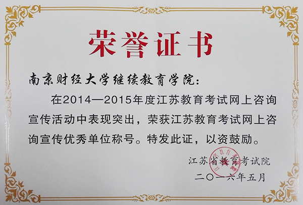 5月9日,江苏省教育考试院通报了“2014-2015年度江苏教育考试网上咨询宣传活动”评选结果,我校普通本科招生办公室和继续教育学院分别被授予“网上咨询宣传优秀单位”称号。