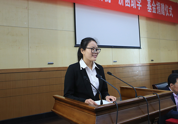 税务1301班的沈静同学代表受助学生向基金捐赠者张敬群先生以及为基金的设立提供大力支持的省国税局、省税务学会等单位表示感谢!她表示,张老先生在古稀之年仍然致力于税史研究,笔耕不辍,对财税专业的学生是一种激励,更是大家学习的标杆。受助学生一定不辜负张老先生等的殷切期望,努力读史研税,弘扬税收文化,夯实专业基础,掌握专业技能,励志成人成才,为国家财税事业的发展贡献力量,并以实际行动回报张敬群先生的大爱行为。