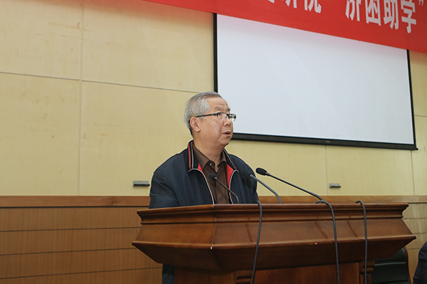 基金捐助人、省税务学会常务副会长张敬群讲话。他表示,用《中国税史品读》的全部稿酬资助贫困大学生,既符合习近平总书记“精准扶贫”的要求,又体现了社会主义税收“取之于民用之于民”的本质,非常值得。他祝愿并坚信,寄寓着诸多同仁爱国情怀和奉献精神的助学活动一定会结成正果。