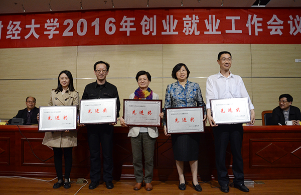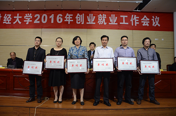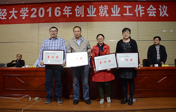 副校长王开田宣读了《关于2015年度毕业生就业工作的表彰决定》。工商管理学院、国际经贸学院、会计学院、财政与税务学院、食品科学与工程学院获得“2015年度就业管理先进奖”。 信息工程学院、金融学院、国际经贸学院、应用数学学院、经济学院、财政与税务学院获得“2015届统招本科毕业生就业率单项奖”。艺术设计学院、财政与税务学院、会计学院获得“2015届毕业研究生就业率单项奖”。应用数学学院、会计学院、金融学院获得“2015届统招本科毕业生升学出国率单项奖”。随后,校领导为获奖学院代表颁奖。