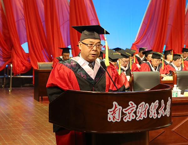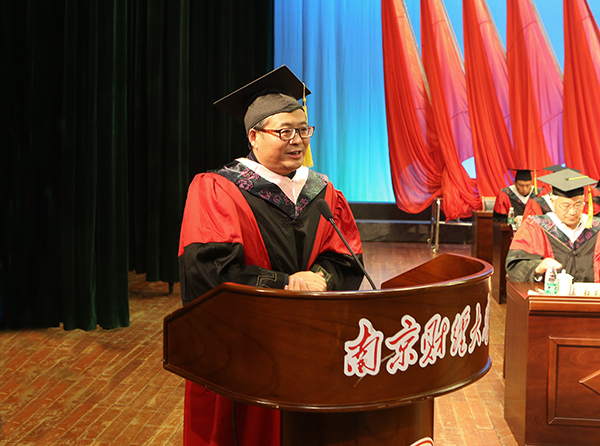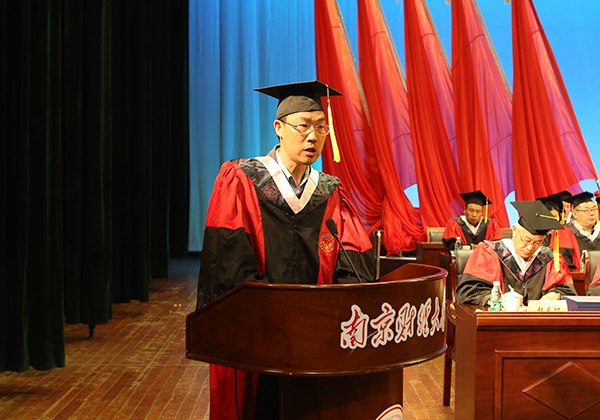校长、校学位委员会主席宋学锋教授致辞。他代表学校向顺利完成学业并获得硕士学位的同学们表示热烈的祝贺!他指出,今年对我们所有南财人来说是特殊而有意义的一年,学校即将迎来建校60周年华诞。六十年为一甲子,意味着轮回与更替,南京财经大学站在了新的历史起点上,即将开启新的征程。我们应用心感悟和品味“自谦 自信 务实 超越”的校训精神:自谦,不论是为人还是为学方面,都要做到自谦,即客观正确地看待自我,并在此基础上扬长避短;自信,可以激发潜意识,让我们释放无穷的热情、精力和智慧;务实,即脚踏实地、注重实践、真抓实干,不急功近利,不慕好虚荣;超越,就是要追求卓越、创新,努力发展。他强调,“凡是过去,皆为序章”,年轻人要勇于卧薪尝胆,建立批判性思维,学会独立思考,坚持创新;要以“失败虐我千百遍,我待创新如初恋”的精神,正确对待挫折和失败,不断砥砺前行。学习方面,不应甘做知识的搬运工,而要学习到真知;工作方面,应要少一份急功近利,多一份持之以恒。最后,宋学锋校长祝福毕业生一步步走向成功,创造辉煌,开启人生的新篇章,成为南财大的骄傲!希望大家常回家看看!
