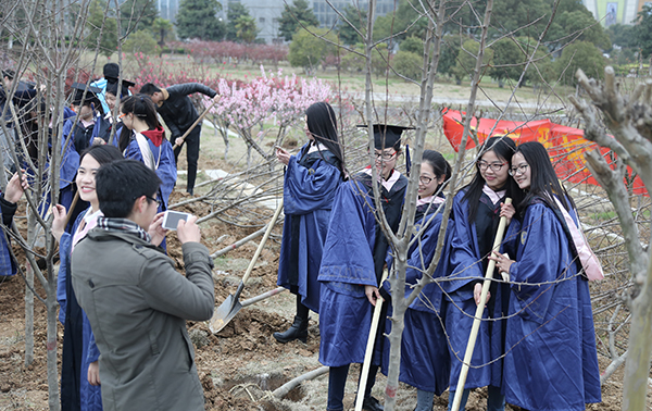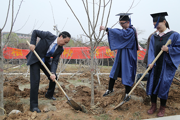 毕业典礼结束后,校党委书记陈章龙、校长宋学锋来到图书馆旁的海棠园,和研究生导师、毕业研究生一起破土种树,送上良好的祝愿。在欢声笑语中,大家纷纷在自己亲手种下的海棠树下合影留念,在母校留下了最美的一刻。