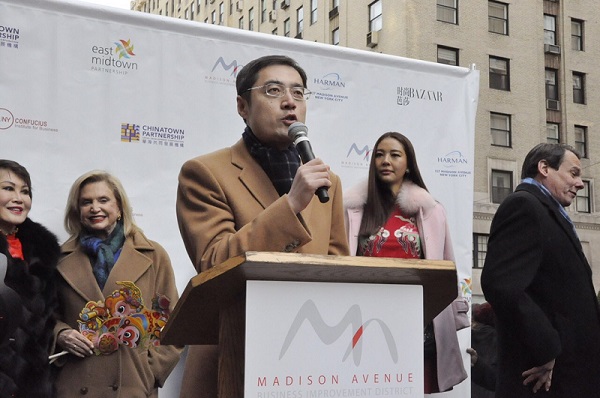 中国驻纽约总领馆副总领事程雷,美国国会众议员Maloney女士,华埠商改区行政总监陈作舟先生, 麦迪逊大道商业发展区域主席Matthew Bauer先生,中东城商业发展区域主席Rob Byrnes先生,上海外滩商贸促进会Michelle Lee女士,纽约州立大学商务孔子学院中方院长孙冬博士、美方院长Maryalice Mazzara博士等参加活动。程雷副总领事向到场的民众致以新春问候和祝福,并祝福未来的生活更美好。Maloney女士表示,本次活动恰逢纽约公立学首次将中国春节设为假期,具有特殊意义。中国城、麦迪逊大道、中东城商圈的负责人认为,活动必将促进三个商圈的互动与合作。Michelle Lee女士认为,随着中美商贸关系日益密切,双方的合作有稳固的基础和广阔的前景,必将带来双赢。Rob Byrnes先生和孙冬院长分别致欢迎辞。之后,上海外滩商圈与麦迪逊大道商圈正式签署建立合作伙伴关系协议。嘉宾共同为“从麦迪逊大街到麦迪逊大道”春节庆祝活动剪彩并启动舞龙舞狮游行。