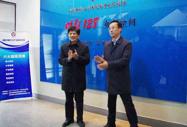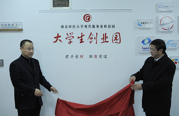 南京市商务局副局长张雁宁、南京财大科技园有限公司董事长胡建渊共同为大学生创业园揭牌