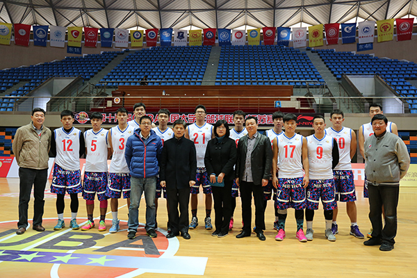 校长宋学锋、副校长邱伟芬现场观看比赛并与我校篮球队教练员和运动员合影 体育部供图
