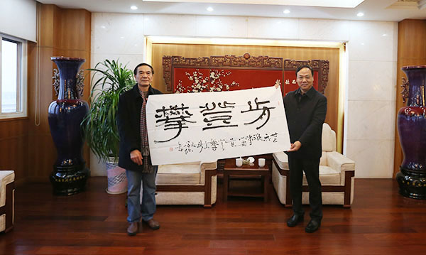陈章龙书记和闵祥德教授共同展示隶书作品《肯登攀》 党委宣传部供图