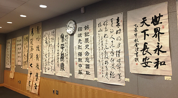 本次庆典还举办了以“和平”为主题的书法展。书法展由我校商务孔子学院、纽约人文协会以及纽约华裔书法家协会联合举办,以纪念反法西斯战争胜利70周年。20余幅书法作品进行了展览,来宾们参观后赞不绝口。