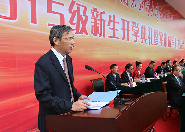 9月17日下午,南京财经大学红山学院2015级新生开学典礼暨军训成果汇报大会在桥头校区体育场隆重举行。校党委书记陈章龙,校长宋学锋,副校长鞠兴荣、俞安平,副校长、红山学院理事长华仁海及承担此次军训任务的解放军94994部队中校韦国龙出席大会,我校相关部门负责人、红山学院党政负责人及2000余名红山学院2015级新生参加大会。
