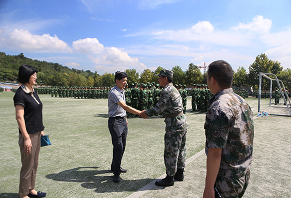 陈章龙书记、宋学锋校长来到训练场地,向承担本次军训任务的部队官兵们表达了诚挚的谢意,并询问了带训教官的住宿、饮食情况,并要求相关部门做好后勤保障,确保军训工作的顺利进行。陈章龙书记、宋学锋校长走到学生中间,进一步了解军训情况,并对学生们初步的军训成果表示充分肯定。鼓励同学们再接再厉,保持饱满的精神状态,锻炼体魄,磨练意志,为自己的大学生活留下精彩一笔。