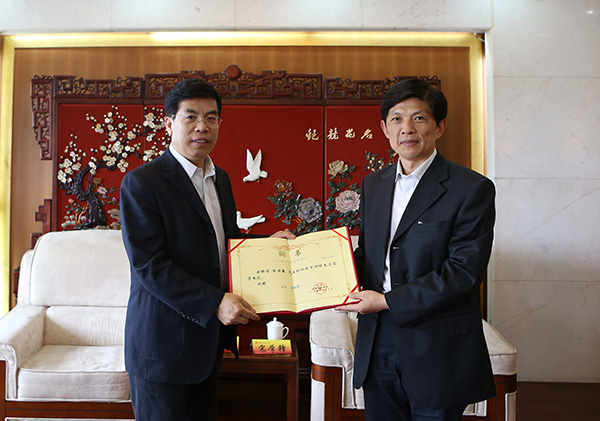 宋学锋校长向张国春秘书长颁发荣誉教授聘书 党委宣传部供图