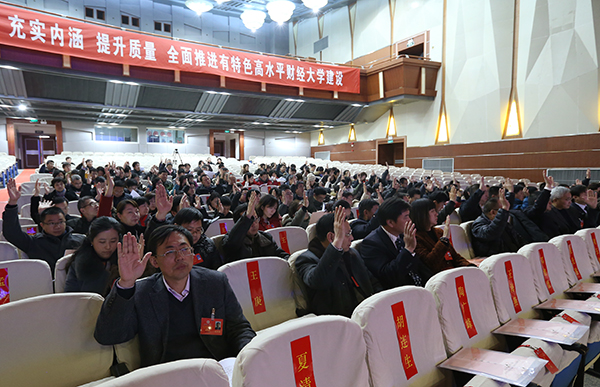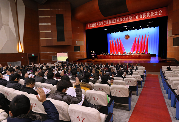 会议还通过了我校第三届“两代会”的八项议程:一、听取并审议学校工作报告;二、听取并审议南京财经大学“两代会”工作报告;三、听取南京财经大学第三届教代会提案征集情况报告;四、审议南京财经大学工会经费审查工作报告;五、审议《南京财经大学章程(草案)》;六、审议《南京财经大学教职工代表大会实施办法(草案)》;七、审议《南京财经大学2015-2017年绩效工资方案(草案)》;八、选举产生第三届教职工代表大会执行委员会委员、提案工作委员会委员、工会委员会委员和工会经费审查委员会委员。