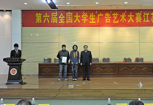 在第六届全国大学生广告艺术大赛中,江苏赛区获“全国优秀分赛区奖”,我校获“江苏赛区优秀组织奖”。我校姚杰老师获“全国优秀工作者”称号,姚杰、刘明、何卫东三位老师被评为“江苏赛区优秀指导老师”。我校学生作品《海天招牌拌饭酱广告策划书》获江苏省策划类二等奖,《安琪儿妇产医院 保密篇》、《米饭的艳遇》、《我的世界,因我不凡》获江苏省平面类二等奖,《人在囧途之越穿越囧》、《阿T正传》获江苏省微电影类二等奖。
