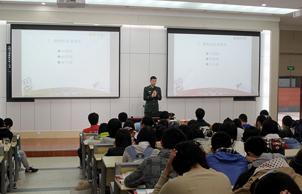 栖霞区消防大队仙林中队中队长薛立先作消防疏散知识培训 校摄协 资评13级 张欣彤/摄