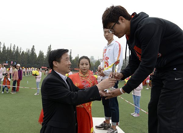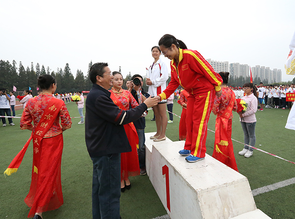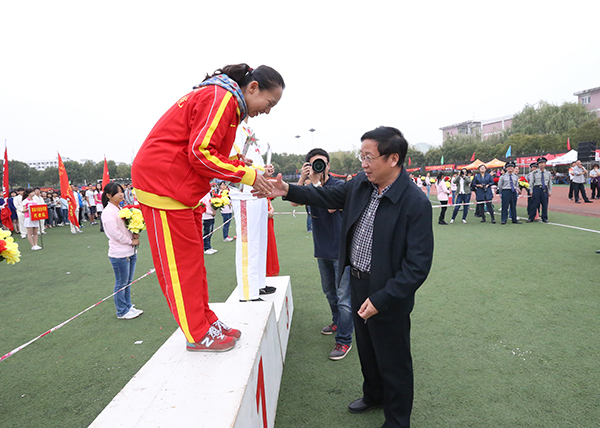 副校长鞠兴荣为男女团体总分前三名的代表队颁奖 校摄协 佳木/摄