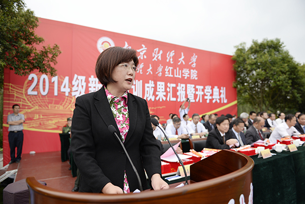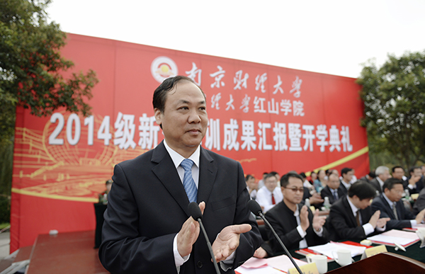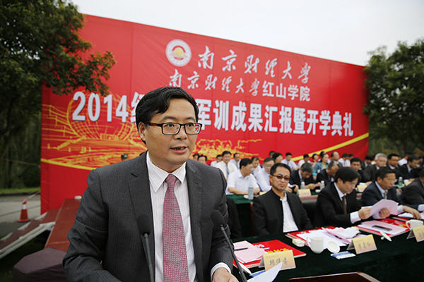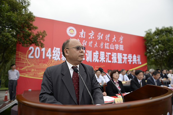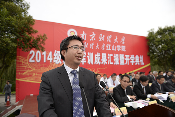 陈章龙书记致辞。他代表全校师生员工向2014级本科新生表示衷心的祝贺和热烈的欢迎,并以“南财精神与你同行”为主题对同学们提出三点希望:第一,以南财大为家,希望大家用心呵护,共同为学校添砖加瓦,塑造更美丽和谐的校园;第二,以南财精神为动力,鼓励每一位学生做到自由探索和独立思考,张扬自己的个性,具有良好的职业能力与素养、道德规范,拥有宽广的视野、博大的胸怀、强烈的责任担当,能够依据自己内心的追求决定自己前进的路程;第三,学会学习和生活,打牢专业基础,掌握学习方法,营造和谐的人际关系,走向健康、高雅、快乐的大学生活。陈章龙书记希望同学们在未来的日子里刻苦学习、勇于担当、勇于实践、创新思维,谱写人生的美丽新篇章!