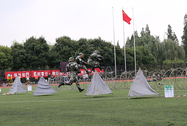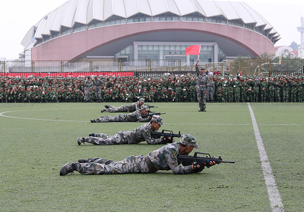 新生军训成果汇报由党委保卫部、武装部部长唐福元主持。护旗手护卫“八一”军旗和校旗进入会场,在庄严的国歌声中,2014级新生军训成果汇报表演正式开始。校党委书记陈章龙在阅兵总指挥范玉峰的陪同下检阅了军训方阵。伴随着雄壮高昂的阅兵进行曲,军训新生迈着坚定有力的步伐昂首挺胸地走过主席台,充分展现了我校学子自强不息、勇往直前的精神风貌。随后,军训新生进行了女子军体拳、女子捕俘刀、男子捕俘拳、军事战术表演和加强步兵班进攻战术等表演,他们昂扬的精神、迅猛矫健的动作赢得了现场观众的阵阵掌声与喝彩。