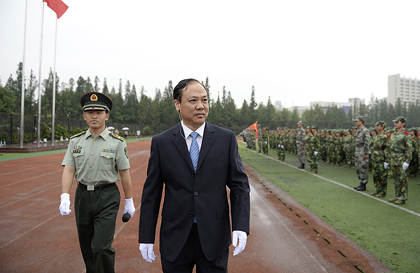 校党委书记陈章龙在阅兵总指挥的陪同下检阅了军训方阵 校摄协 会计11级 巢司宇/摄