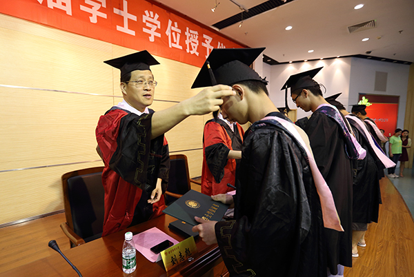 在各学院分管教学副院长宣读《关于授予2014届毕业生学士学位的决定》后,毕业生们身穿学士服,走上前台,校领导及学院领导、教授为他们一一拨过学位帽上的流苏,授予学士学位证书。