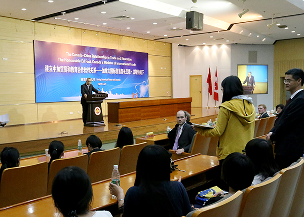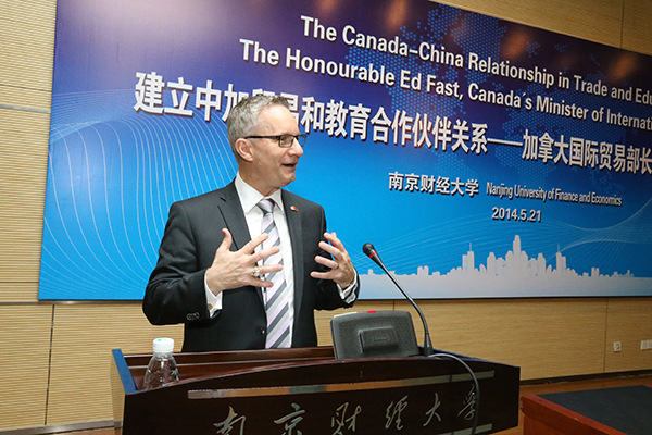 在我校师生的热烈掌声中,艾德·法斯特部长走上讲台发表演讲。艾德·法斯特部长表示,加拿大政府高度重视与中国的合作,呼吁在贸易和教育等领域发掘更多潜力加强合作交流。他说,加拿大有健全的国际教育体系,是中国学生出国留学的最佳地点之一,加拿大政府希望到2020年中国赴加拿大留学生达到9万人,中国学生将有更多机会在完成学业后继续在加拿大工作生活。艾德·法斯特部长表示,选择访问南京财经大学就是因为南财大与多所加拿大高校有着多种形式的学生交流项目,成效良好。