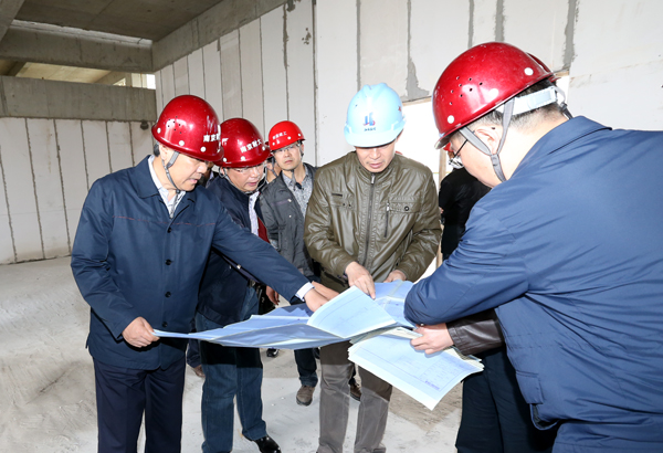 校党委书记陈章龙对科技园项目的工程施工进度、现场安全文明施工给予了肯定。在察看办公用房及报告厅的建设情况时,陈章龙书记一边查看施工图纸,一边就规划布局与相关人员进行讨论,并结合各个区域的功能定位提出了指导意见。陈书记希望全体项目管理和工程建设人员以高度的责任感和使命感投入到科技园项目工程建设中,在确保工程建设质量的基础上,加快推进工程建设进度。