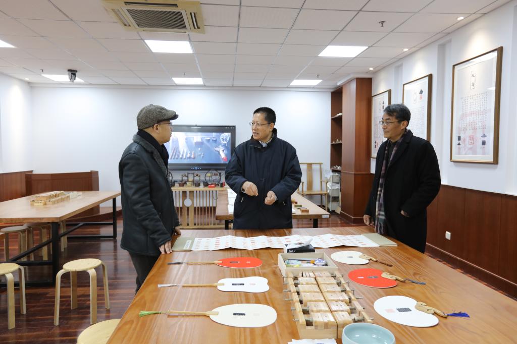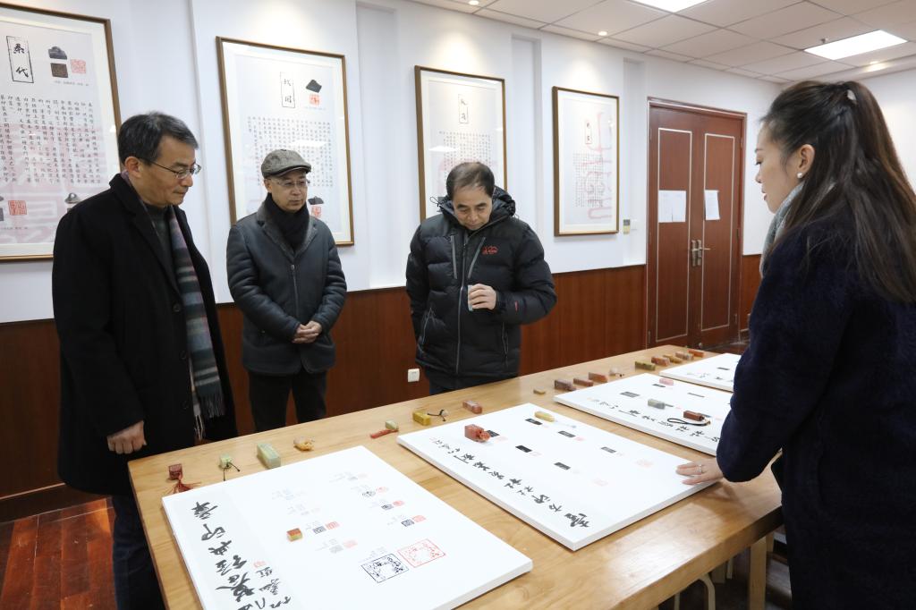 董大胜顾问、孙宝厚会长还实地走访了篆刻文化传承基地。我校篆刻艺术学科带头人仇高驰教授介绍了篆刻艺术在我校的传承发展,艺术教育中心副主任王钱美介绍了我校美育工作情况。