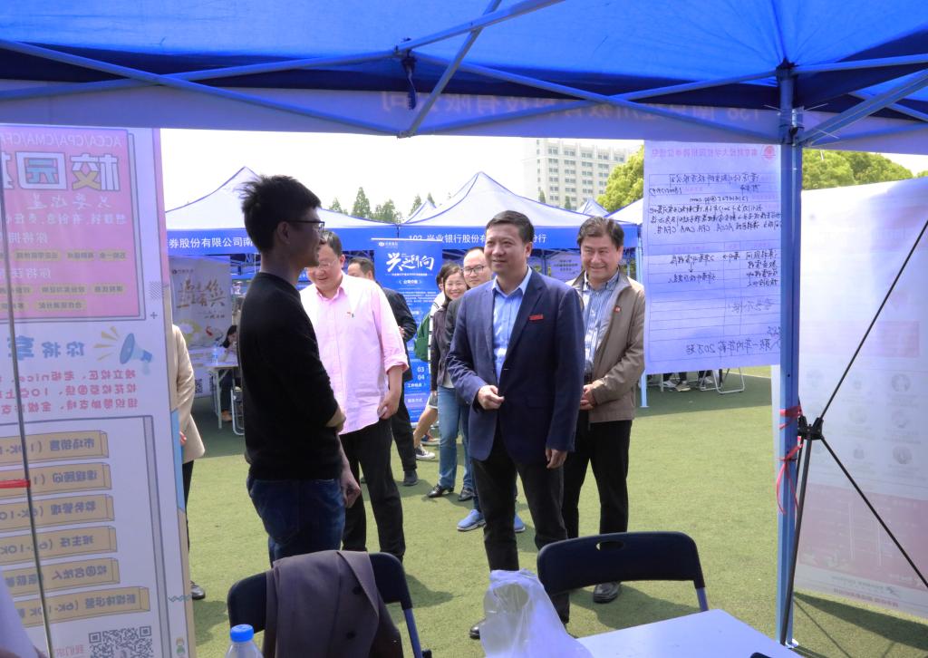 4月28日、29日上午,江苏省2021届高校毕业生“百校千场万岗”就业促进行动系列活动之“宁聚英才 乐业金陵”南京财经大学2021届毕业生春季校园招聘会在仙林校区西苑田径场成功举办。校党委书记张利民,校长程永波,校党委常委、副校长李群深入招聘现场,并与用人单位及求职毕业生亲切交谈。相关职能部门负责人、各学院中层干部、学工秘书、研究生秘书、毕业班辅导员来到现场了解用人单位需求,积极推荐毕业生。2021届毕业生、部分2022届毕业生参加招聘会。