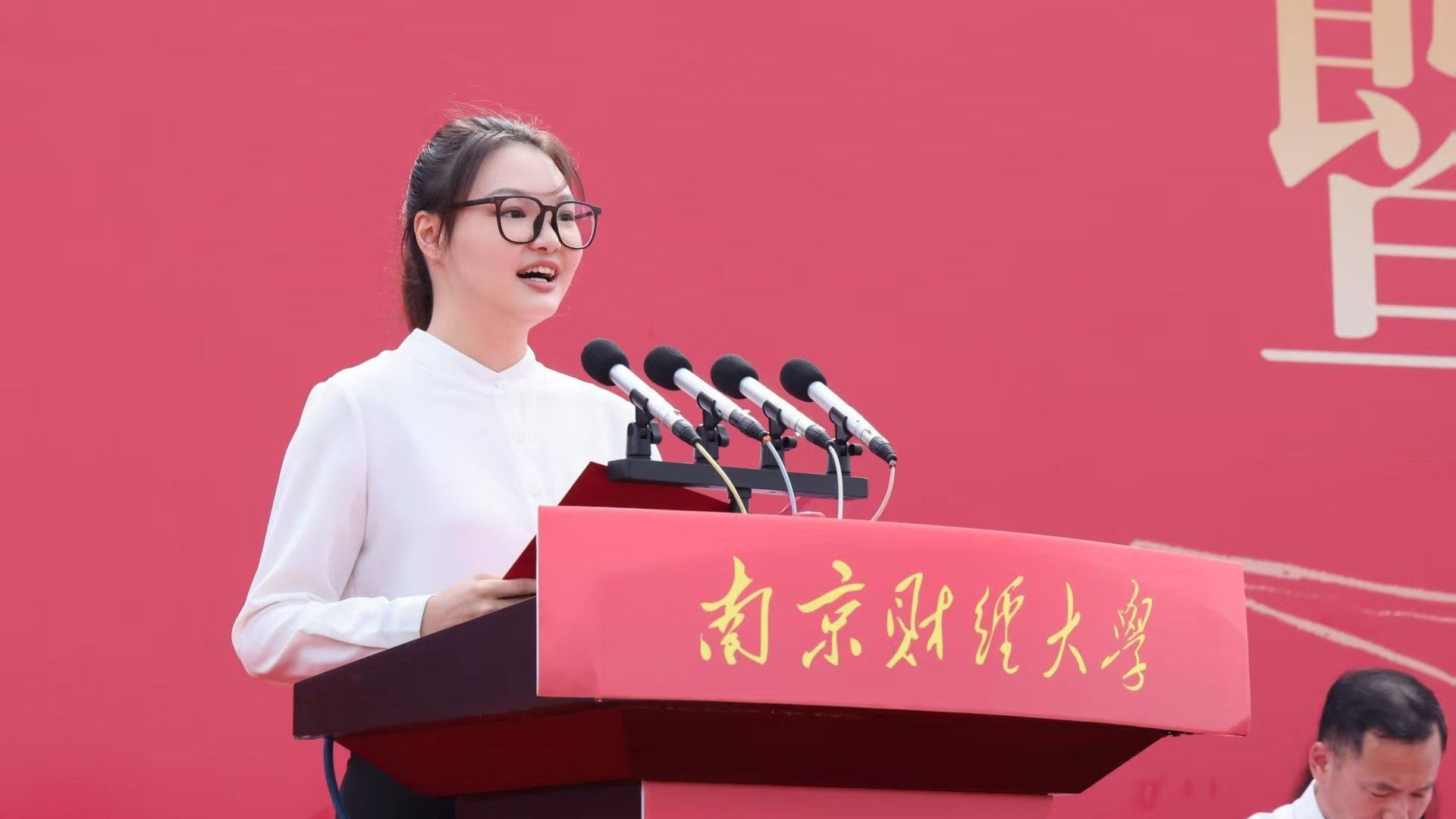 在校生代表、经济学院2024级硕士研究生陈诗雨发言。她回顾了自己与南财共成长的五年求学时光,希望大家珍惜时光、勤学笃行,明确目标、坚定前行,让青春在祖国需要的地方绽放光彩。