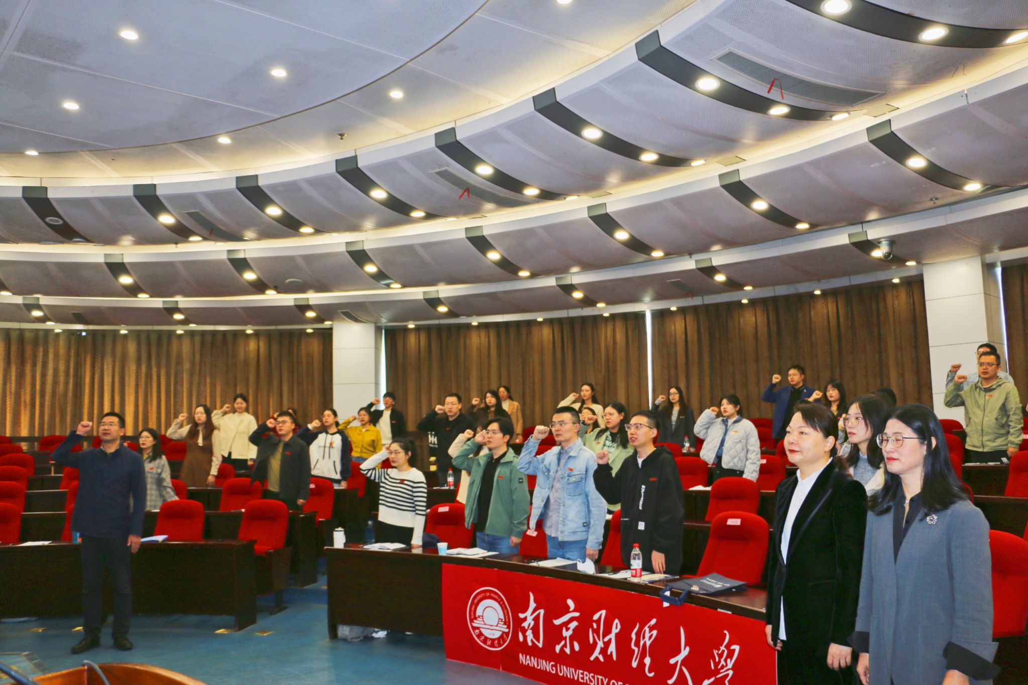 仪式上,新进教职工佩戴崭新的校徽,一起学唱校歌《南财大之歌》。随后,新进教职工在党委教师工作部副部长、人事处副处长何海新的带领下进行了庄严的入职宣誓。