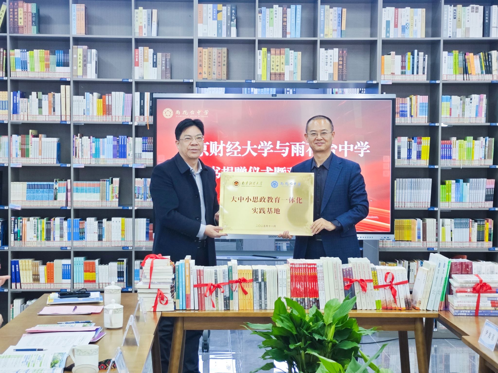 赵光辉书记聘请全真真副处长为雨花台中学“科学教育顾问团”顾问并颁发聘书;张杰书记代表我校南京招生组向雨花台中学捐赠图书;刘衍民副校长与赵光辉书记共同为“大中小思政教育一体化实践基地”揭牌。