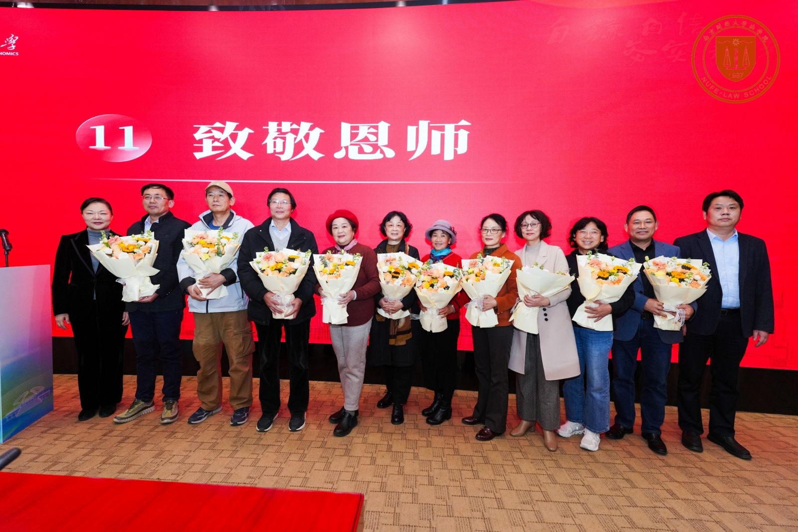 在温馨感人的“致敬恩师”环节,校友代表为法学院老教师代表献上鲜花,表达对恩师的崇高敬意与深深感激。随后,大会举行了“创新创业导师”聘任仪式和“法学院教育发展基金”启动仪式暨校友捐赠仪式,展现了校友们支持学院发展、助力学子成长的深切情怀与实际行动。