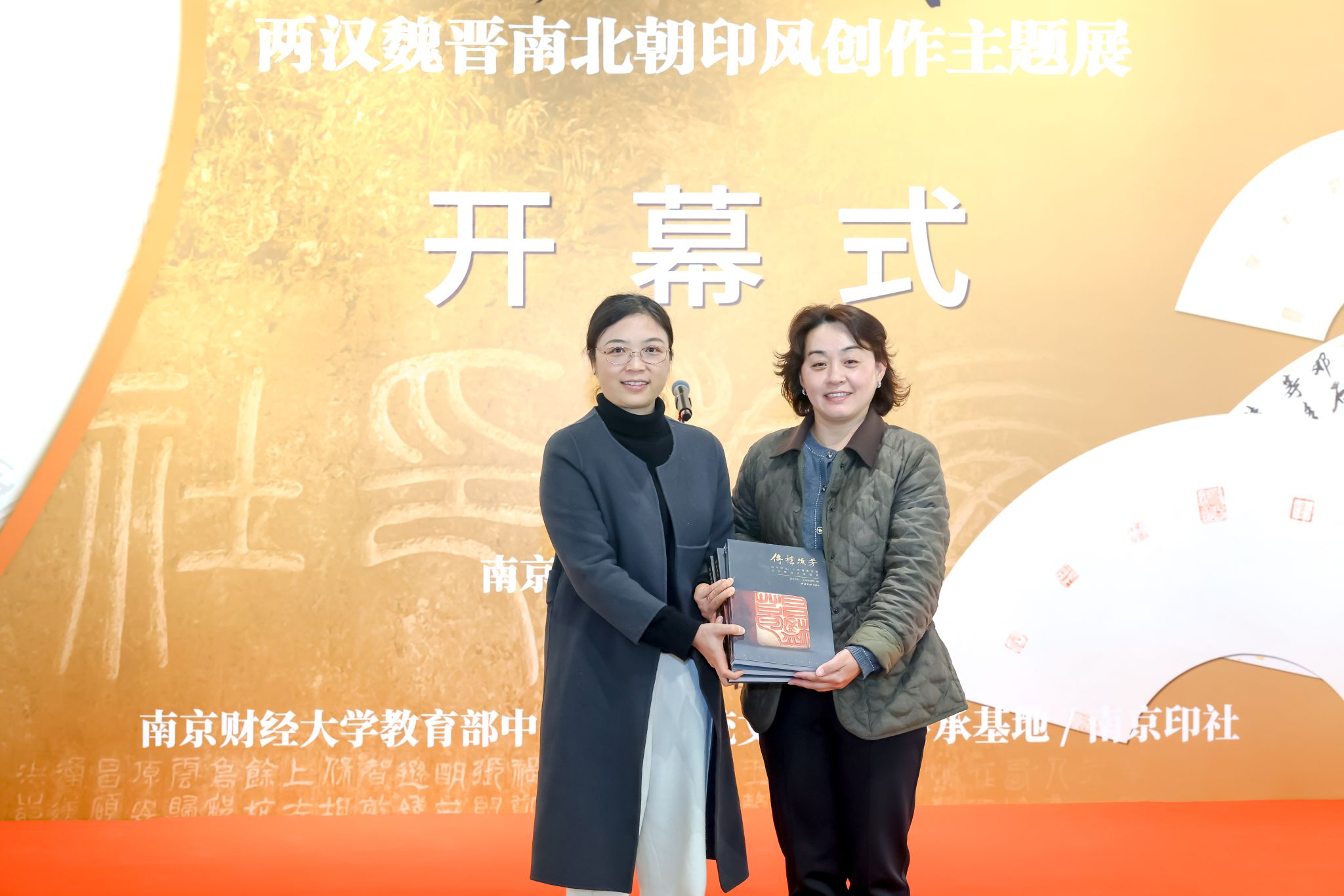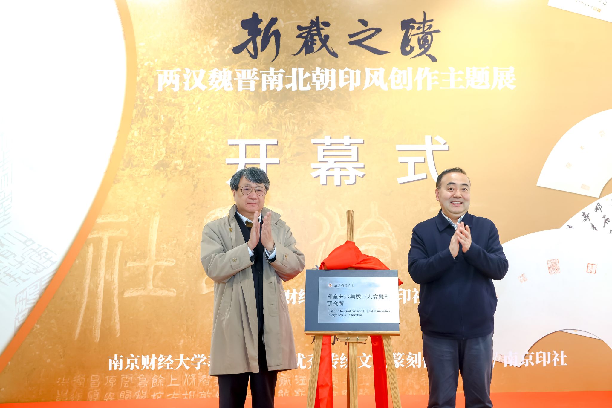 12月2日下午,“西泠印社藏历代印章原拓题跋扇面展”暨“斩截之迹——两汉魏晋南北朝印风创作主题展”在我校美术馆开幕。全国政协常委、校长程永波,中国文联副主席、西泠印社副社长兼秘书长陈振濂,党委常委、副校长叶林祥,西泠印社党委委员、社委会副主任王丽艳,校党政办、党委宣传部、科学研究院、艺术教育中心等部门负责人,以及我校本次江苏艺术基金篆刻人才培训班全体学员、篆刻传承基地师生和书法篆刻专业研究生代表参加活动。开幕式上,程永波校长与陈振濂副主席共同为“南京财经大学印章艺术与数字人文融创研究所”揭牌。科学研究院副院长(主持工作)肖玉杰主持本次活动。