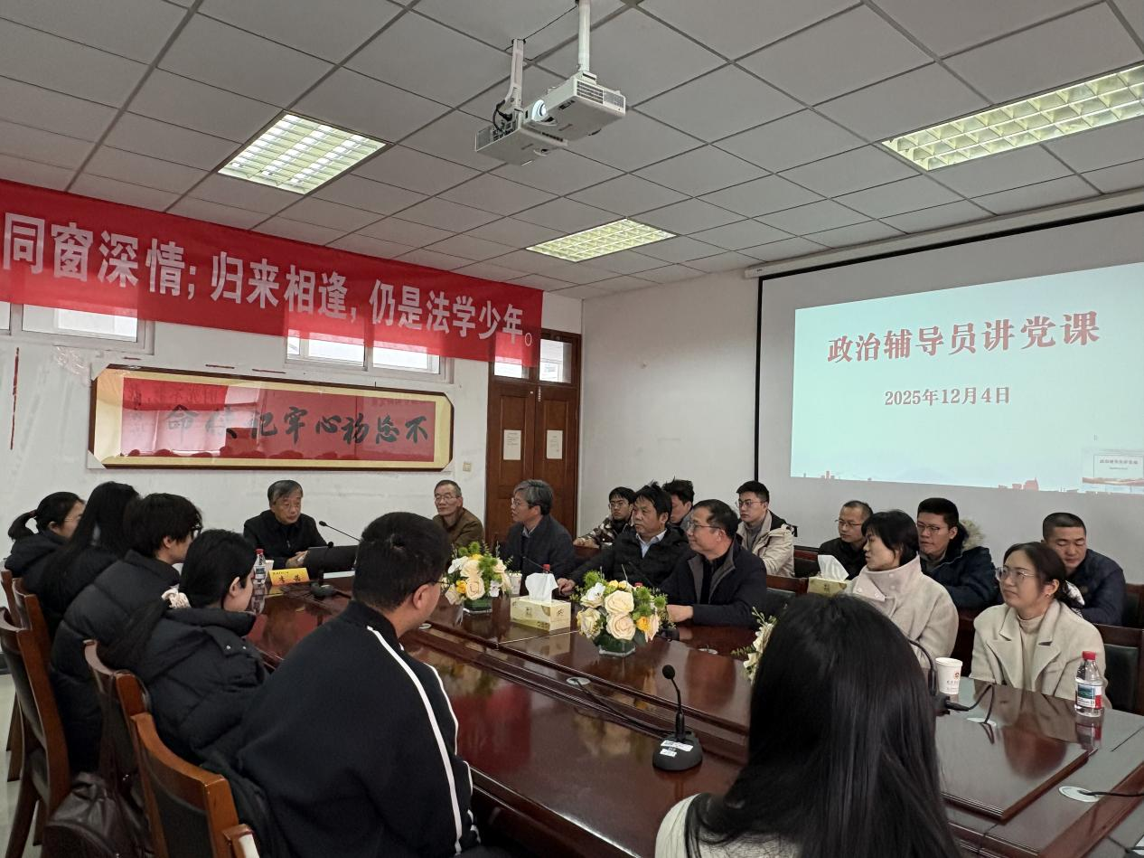 随后,李茜书记在德正楼404会议室以“深入学习贯彻党的二十届四中全会精神,全面推进依法治国建设”为主题讲授党课。他结合自己的学习心得体会对党的二十届四中全会精神进行了系统解读,要求大家深入学习领会、认真抓好落实,切实把思想和行动统一到全会精神上来。他结合近期召开的中央全面依法治国工作会议精神,围绕全面推进法治中国建设,结合学校实际和法学院专业特色,提出三点要求:一是深刻认识习近平法治思想的理论价值和实践伟力,加深理解全面依法治国在推进中国式现代化进程中的重要保障作用,以学校案例获评全国高校“依法治校十大典型案例”为契机,共同营造良好的校园法治环境;二是准确把握新时代全面依法治国总体要求,坚持人民至上原则,做到知法、懂法、守法、用法;三是深入学习习近平法治思想最新成果,理解“依法治国和依规治党有机统一”这一核心要义,不断提升运用法治思维和法治方式的能力。