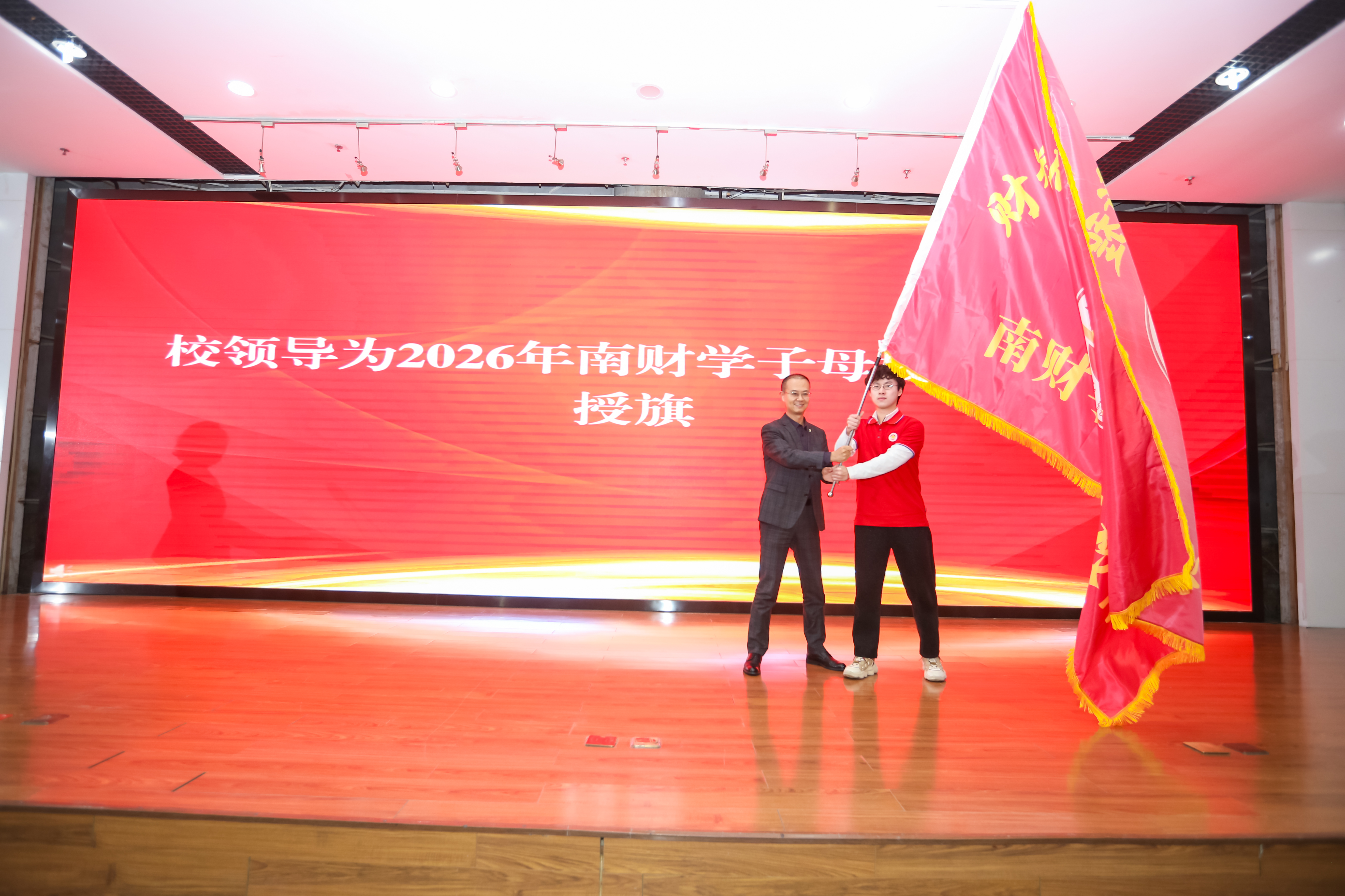 刘衍民副校长为志愿者代表授“财智启新程,与我共荣光”2026年南财学子母校行出征旗。